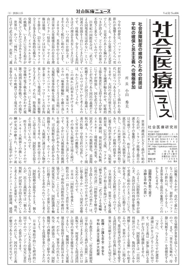 社会医療ニュース 最新号 第606号(2026年1月15日発刊) 過去の社会医療ニュースの1ページ目はこちらからご覧いただけます。 ・2025年 社会医療ニュース 1ページ目 ・2024年 社会医療ニュース 1ページ目 ・2023年 社会医療ニュース 1ページ目 ・2022年 社会医療ニュース 1ページ目 ・2021年 社会医療ニュース 1ページ目 ・2020年 社会医療ニュース 1ページ目